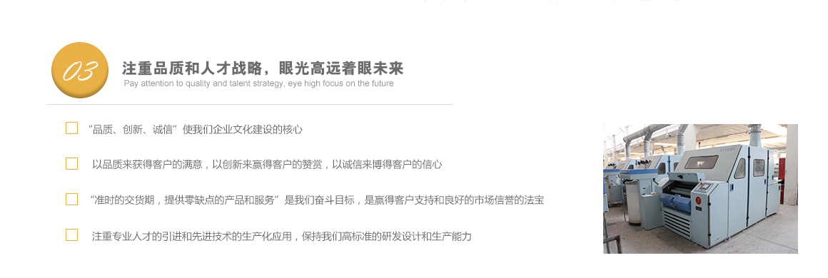 太倉市高陽工貿有限公司是專業從事特種紗生產十數年的一線生產廠家,坐落于江蘇省蘇州市太倉市雙鳳鎮新湖建湖路29號,太倉隸屬長江三角洲經濟圈,交通便捷,經濟發達,是著名的紡織生產基地。 公司歷史要追溯到1982年就成立的新湖毛紡織廠。1996年,毛紡織廠與上海二十二棉在新湖聯合組建了太倉市新湖福利綜合廠。2002年為適應市場的飛速變化,公司轉制重組更名為太倉市高陽工貿有限公司。同時公司適時調整生產經營策略,調整產品品種結構,把生產特種紗作為主要發展方向,純棉、滌綸竹節紗是我們的主要產品。 公司多年來始終保持了持續穩定發展的良好勢頭,在激烈的市場競爭中發展壯大,不斷前行。我們把“走品牌發展之路,創紗線知名商標”作為公司持續發展的核心戰略。以市場為導向,堅持“以品種求發展,以質量求生存”的方針,以增強市場競爭力為中心,對不斷變化的市場環境作出快速反應,品牌戰略的實施。公司注重專業人才的引進和先進技術的生產化應用,具備較強的研發設計和生產能力。 公司一直把“品質、創新、誠信”作為企業文化建設的核心。以品質來獲得客戶的滿意,以創新來贏得客戶的贊賞,以誠信來博得客戶的信心。我們把“準時的交貨期,提供零缺點的產品和服務”作為奮斗目標,贏得了客戶的支持和良好的市場信譽。 高陽工貿有限公司愿與廣大客戶加強合作,共享信息,迎接挑戰,共同發展。客戶需求。了解詳細>>